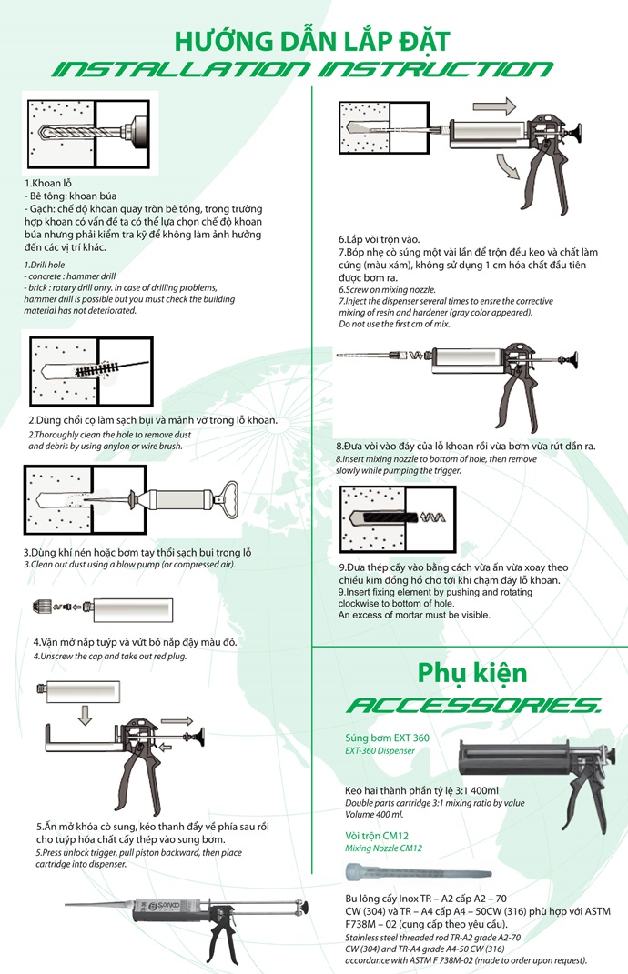 Hóa chất cấy thép Sanko được làm từ vật liệu không gây mùi khó chịu, hoạt động rất tốt trong môi trường ẩm ướt.