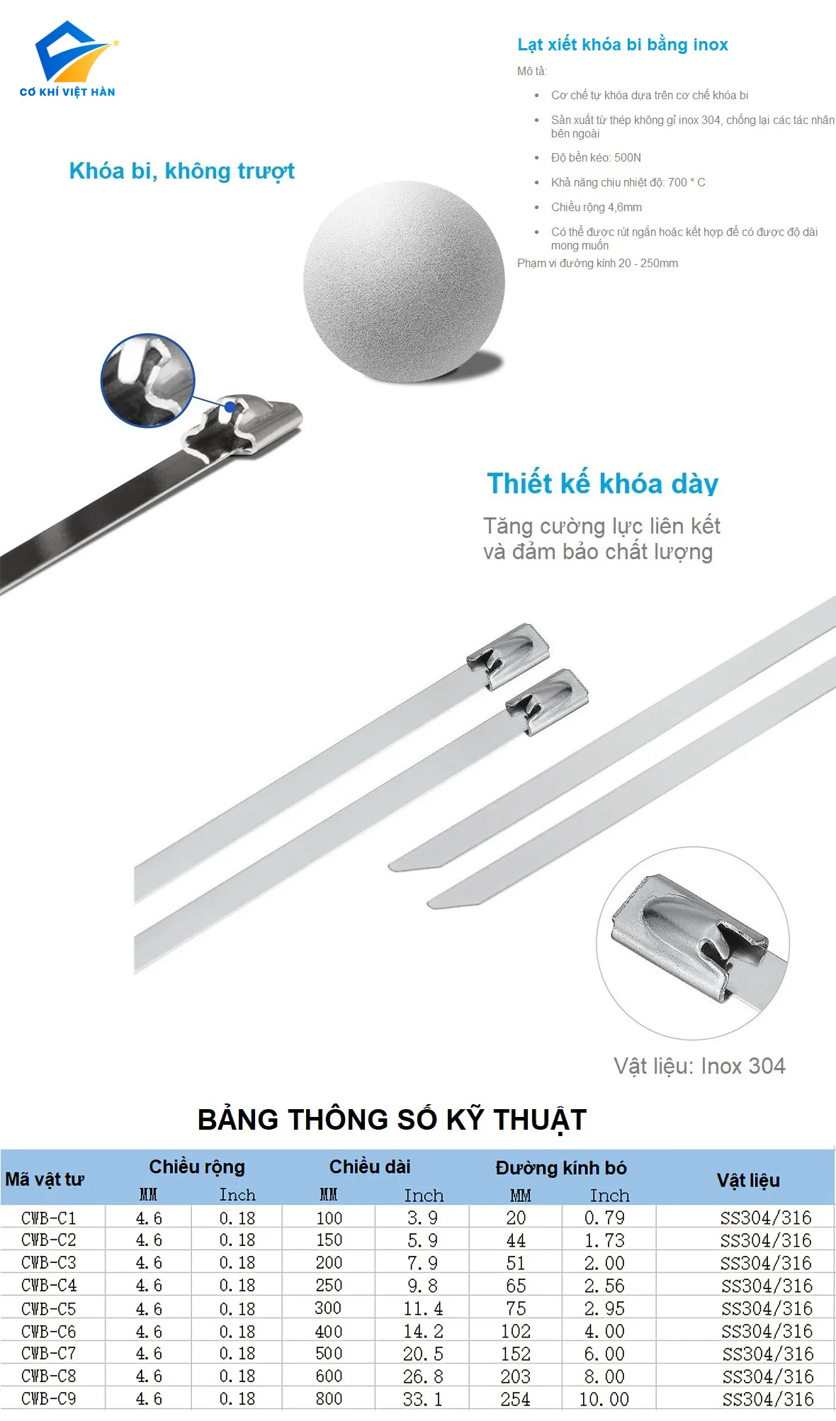 Dưới đây là bảng thông số kỹ thuật của một số loại lạt xiết inox phổ biến, giúp người dùng lựa chọn sản phẩm phù hợp: